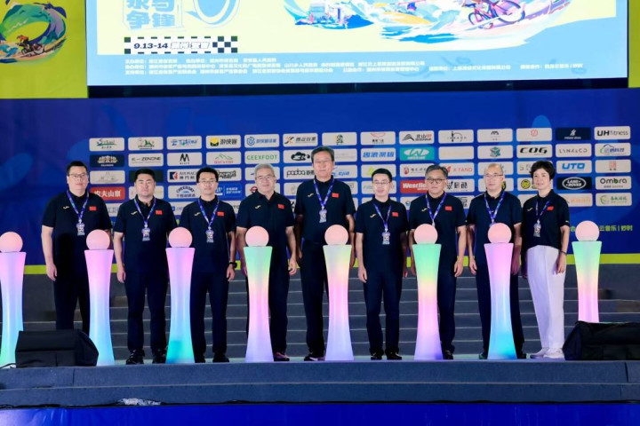 上海市体育局规划产业处处长余诗平(左三)出席“浙江省第六届户外运动大会”揭幕仪式。