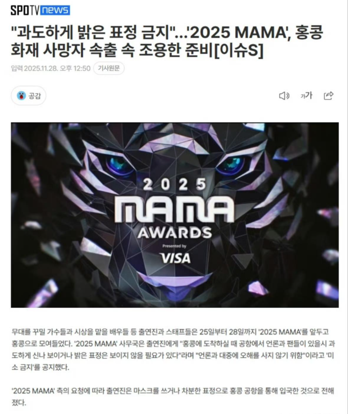 MAMA组委会通知所有演出人员(含艺人、工作人员)抵港时若遇媒体或粉丝接机,需避免呈现“过度兴奋的表情”“面露喜色”或“明亮的表情”,改为佩戴口罩或保持“平静表情”通过机场。