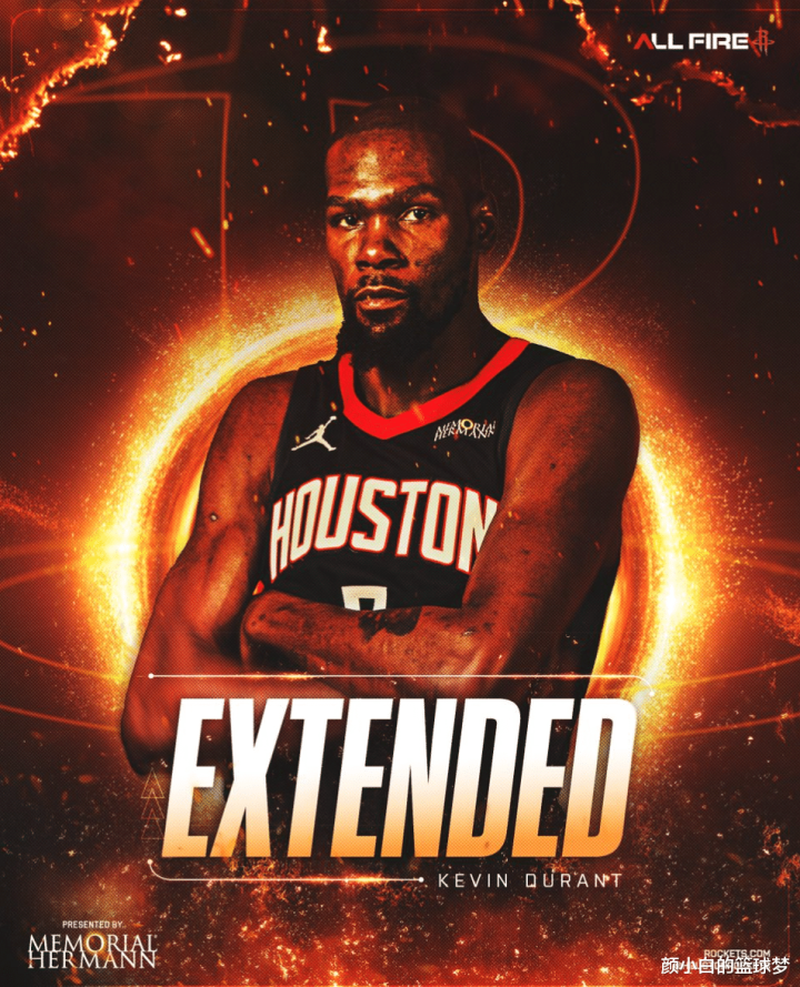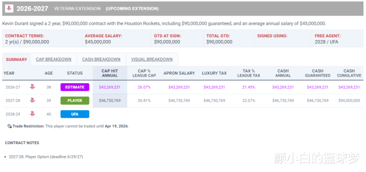 北京时间10月20日,火箭队官方宣布球队已经与凯文-杜兰特达成提前续约,KD这份合同是两年9000万,27-28赛季是球员选项。