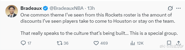 火箭记者Bradeaux写道:从这支火箭队的阵容中我们应该关注到一个点,很多球员为了来到火箭或者留下火箭都做出了巨大的让步,在薪水上做了诸多的牺牲,这反应了球队正在形成的文化,这是一个特殊的群体。