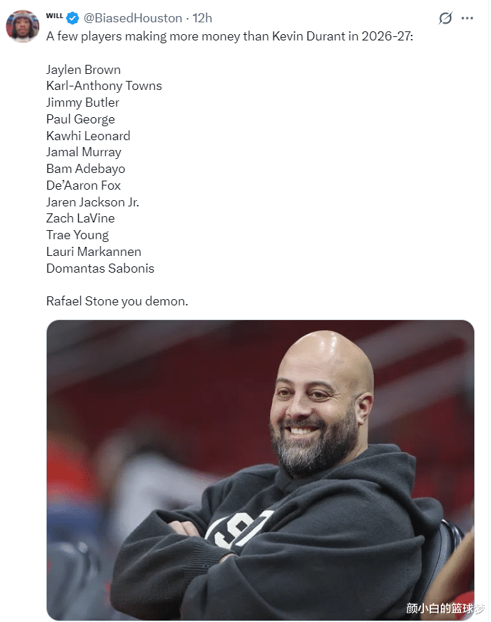 随后休媒晒出26-27赛季薪水会超过杜兰特的球员:杰伦布朗、唐斯、巴特勒、乔治、伦纳德、贾马尔穆雷、阿德巴约、福克斯、小贾伦杰克逊、拉文、特雷杨、马尔卡宁、小萨博尼斯。(这13人有几人能比KD强?)