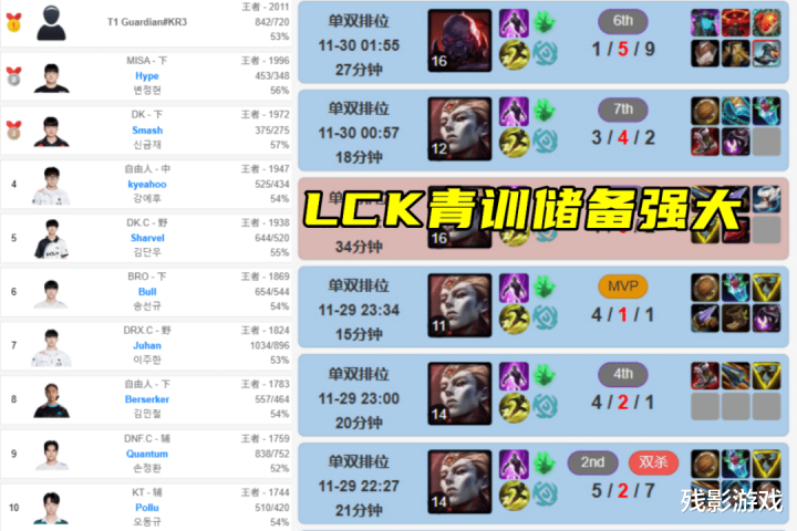JKL自S8夺冠以后,至今仍是LPL的顶级AD,而除他以外,要想列出几个强势的新人AD,可谓是比登天都难。反观LCK这边,T1除了Faker,队员都换了个遍,更是培养出了一批又一批强势新人,可谓是全面领先了咱们LPL。而近期的韩服rank,T1的青训小上单更是直接登顶,引发了不小的热议。而细心的玩家们也是发现了,除了第一以外,韩服前十基本都被LCK所占满了。